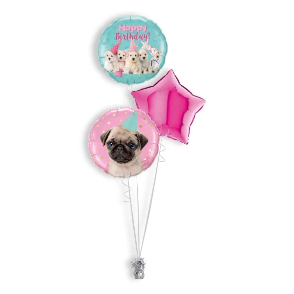 Met deze speciaal samengestelde ‘Birthday Puppies‘ folieballontros van De Ballonnerie heeft u direct een bijzonder cadeau. De ballonnentros is circa 1,75 meter hoog en bestaat uit drie, met helium gevulde, folieballonnen die met lint aan een ballongewicht bevestigd zijn. Maak de verrassing voor de ontvanger nog groter door een speciale boodschap op een kaartje voor de ontvanger achter te laten. De zweeftijd van deze folieballonnen is circa 7 dagen. De tros bestaat uit de volgende drie folie ballonnen.