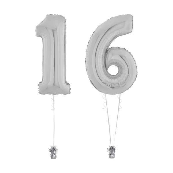 Met deze speciaal samengestelde zilveren cijfers folieballontros van De Ballonnerie heeft u direct een bijzonder cadeau. De ballonnentros is circa 1,75 meter hoog en bestaat uit twee, met helium gevulde, cijfervormige folieballonnen die met lint aan een ballongewicht bevestigd zijn. Maak de verrassing voor de ontvanger nog groter door een speciale boodschap op een kaartje voor de ontvanger achter te laten. De zweeftijd van deze folieballonnen is circa 7 dagen. De tros bestaat uit de volgende twee folie ballonnen.