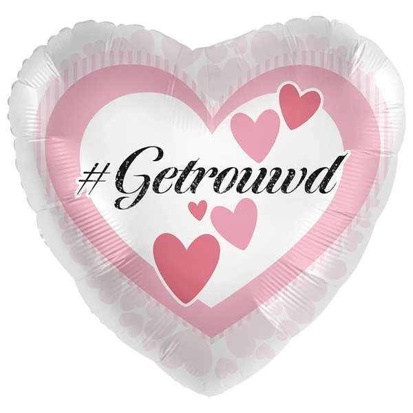 Deze 17 inch folie ballon van het merk Premioloon met 'Getrouwd' opdruk heeft een doorsnede van circa 43 cm. De ballon is gemaakt van een lichtgewicht metallic folie waardoor deze gevuld met helium ongeveer één week blijft zweven. Opgeblazen is de ballon hartvormig en aan twee zijden bedrukt. De ballon is verder voorzien van een zelfsluiter waardoor deze zichzelf afsluit wanneer de ballon volledig is gevuld.